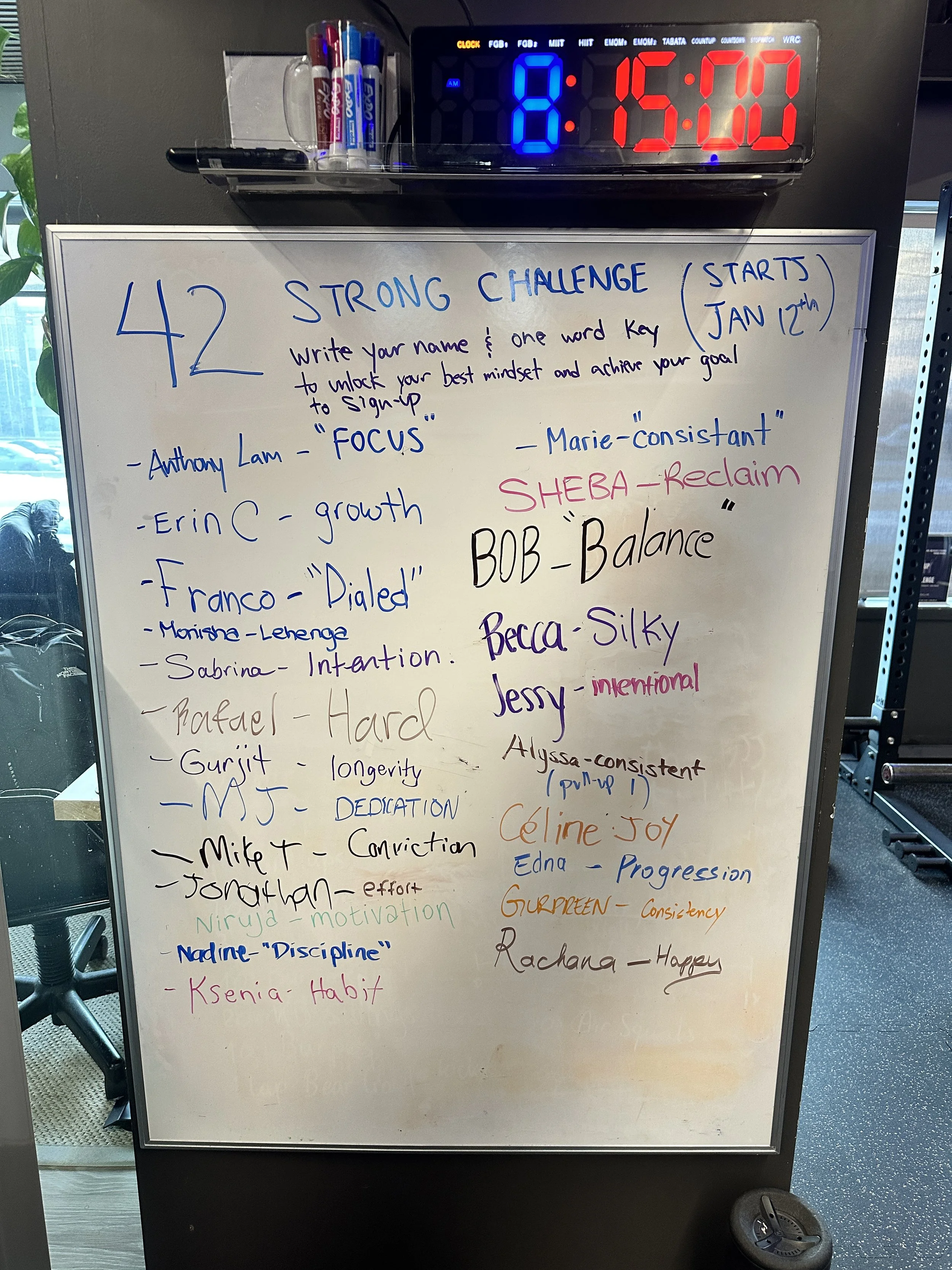 The sign-up rules were simple. Members of our gym signed their name on the community whiteboard with one word that symbolized their personal key to success.